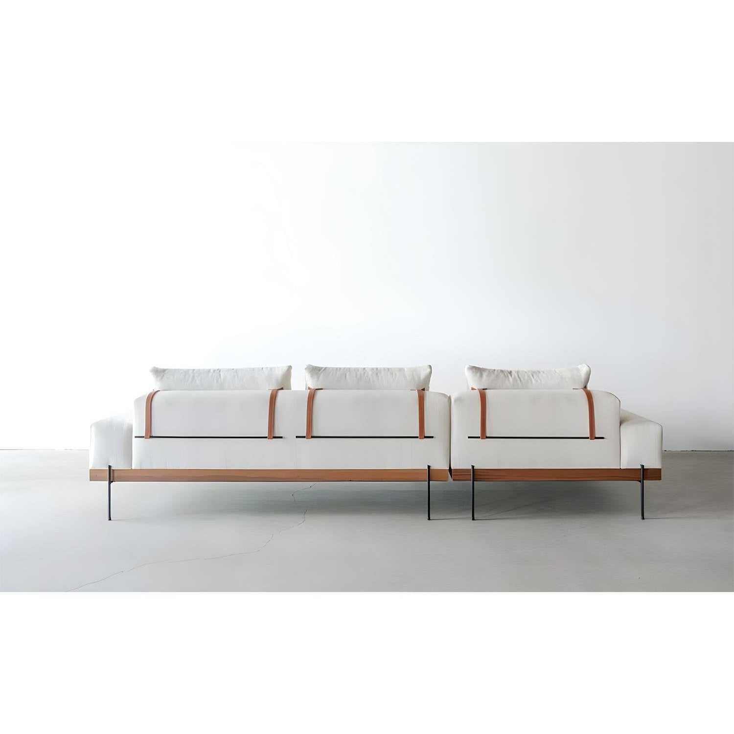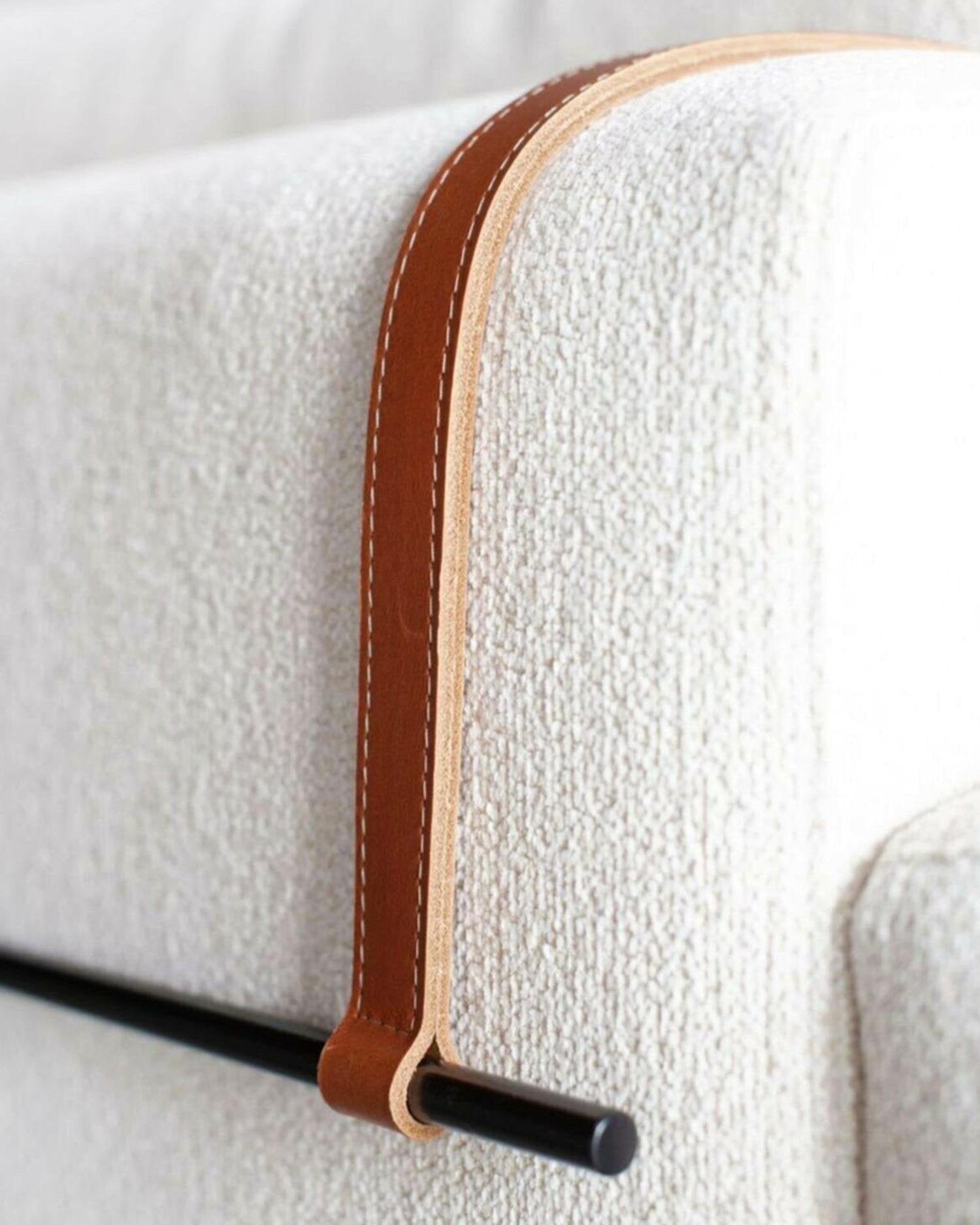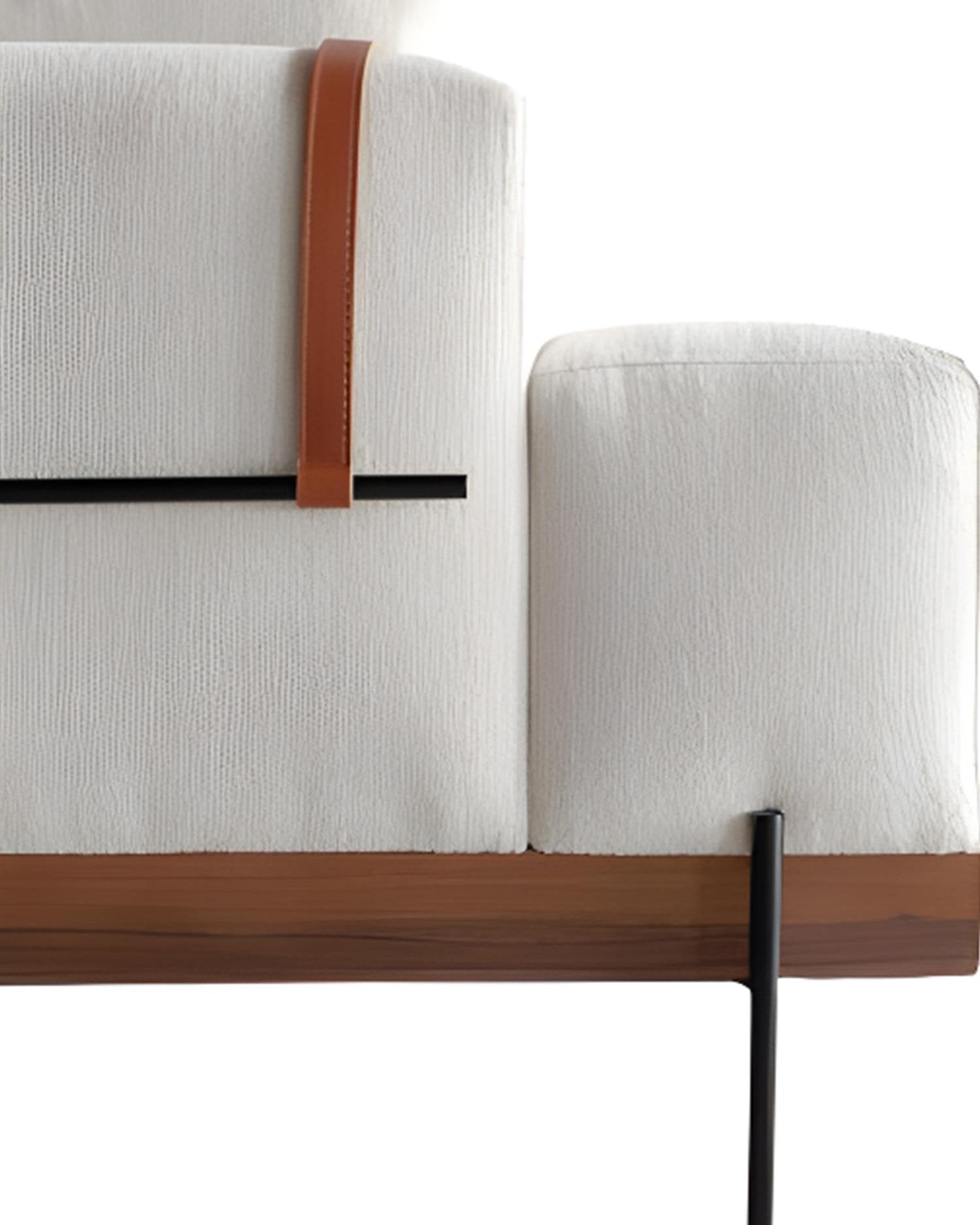Gürgen ağacı iskeleti ve siyah fırın boyalı metal ayaklar, koltuğa dayanıklılık ve estetik bir görünüm kazandırır. Beyaz keten kumaş ise koltuğa zarif bir dokunuş ekler. Ürünün arkasında kullanılan gerçek deri askılar ise işlevselliği ve şıklığı bir arada sunar.