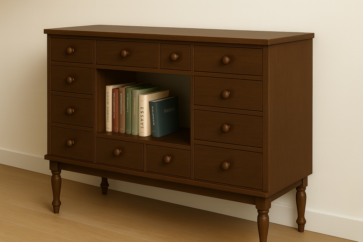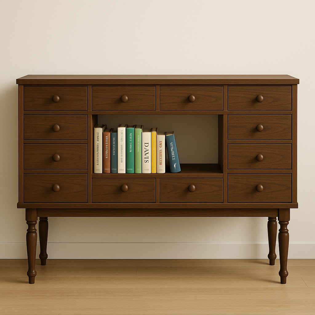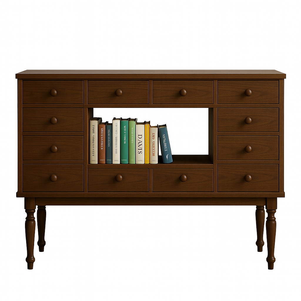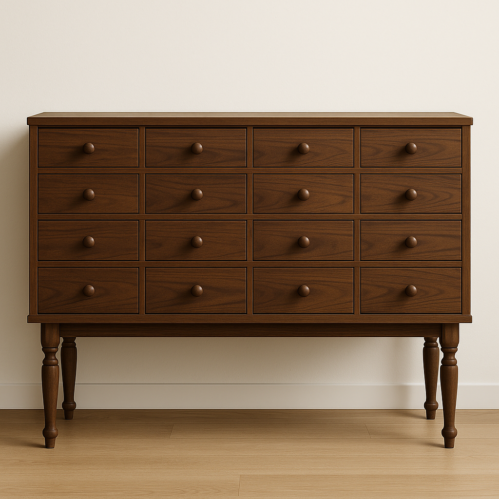 Konsolun simetrik tasarımını tamamlayan 12 yada 16 eşit büyüklükte çekmece hem düzenli depolama hem de estetik bir görünüm sunar. Her çekmece usta marangozlar tarafından tek tek el ile hazırlanmış, montajlanmış ve kontrol edilmiştir. Bu sayede ürün; seri üretimden uzak, tamamen el yapımı, karakteri olan özgün bir mobilya parçasıdır.
