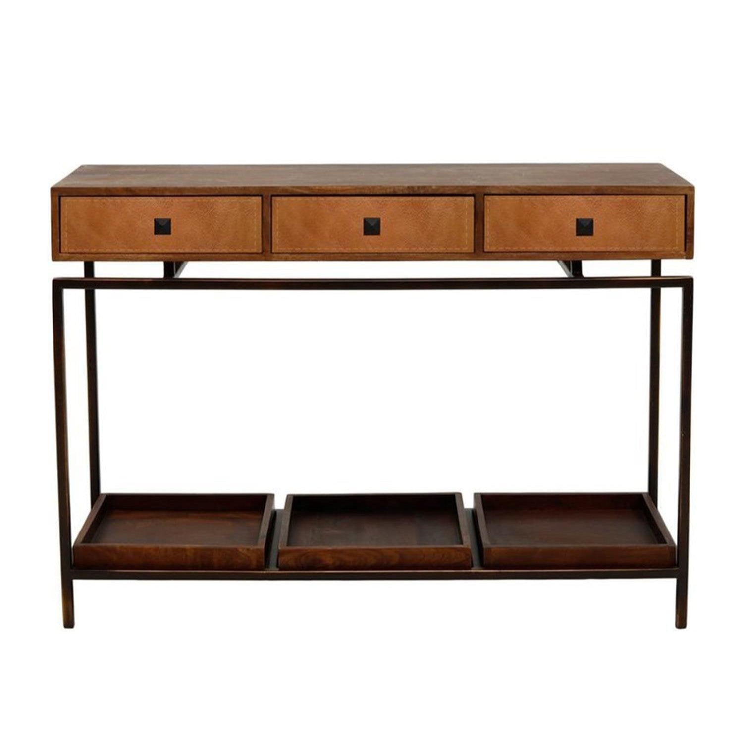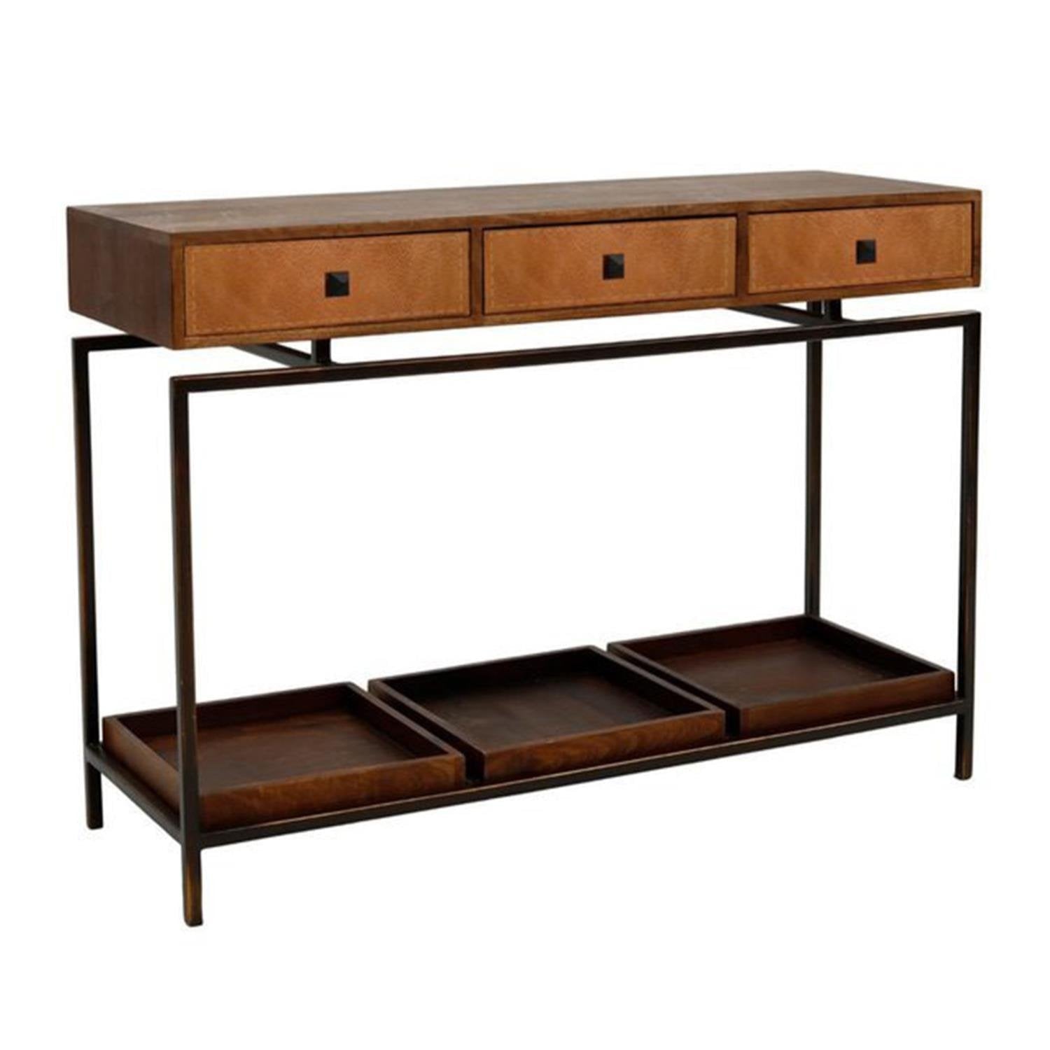 Doğal ahşap ve fırın boyalı metalin zarif kombinasyonuyla tasarlanmıştır. Çekmecelerinde gerçek deri detaylar bulunur, manuel açılır-kapanır mekanizmaya sahiptir. Döküm demir kulplar, ürüne endüstriyel bir dokunuş katmaktadır. Metal iskeleti sağlam ve dayanıklıdır.