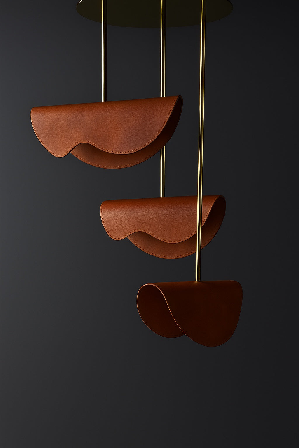 Pirinç tonundaki ince metal çubuklar, deri elemanları zarif bir şekilde taşırken tasarıma dengeli ve lüks bir görünüm kazandırır. Işığın deri yüzeylerde oluşturduğu sıcak yansımalar, ürünü yalnızca bir aydınlatma olmaktan çıkarıp mekânın merkezinde duran sanatsal bir objeye dönüştürür.