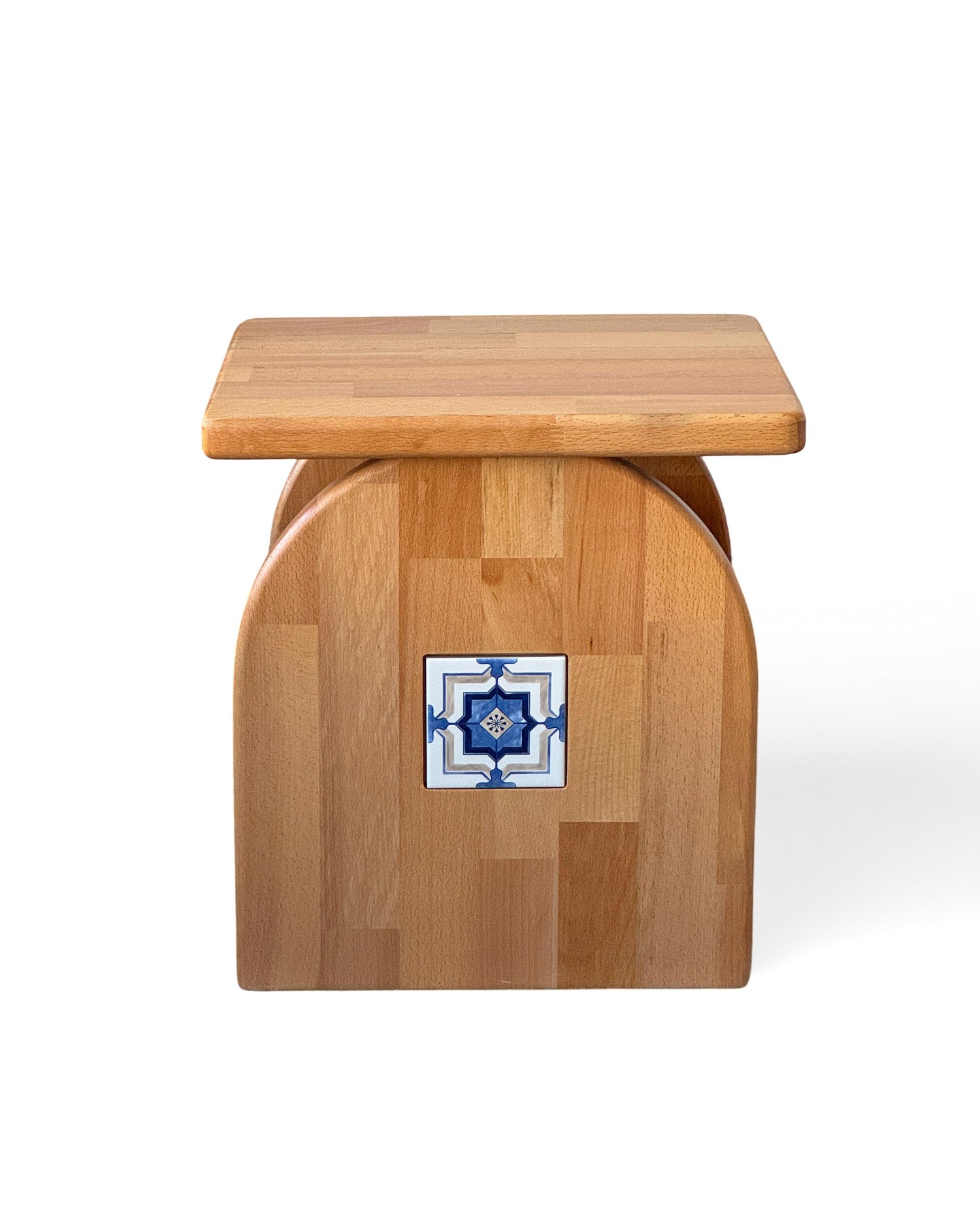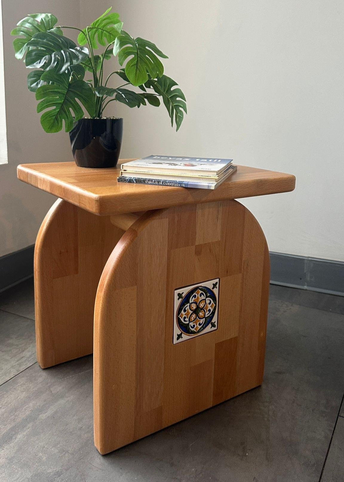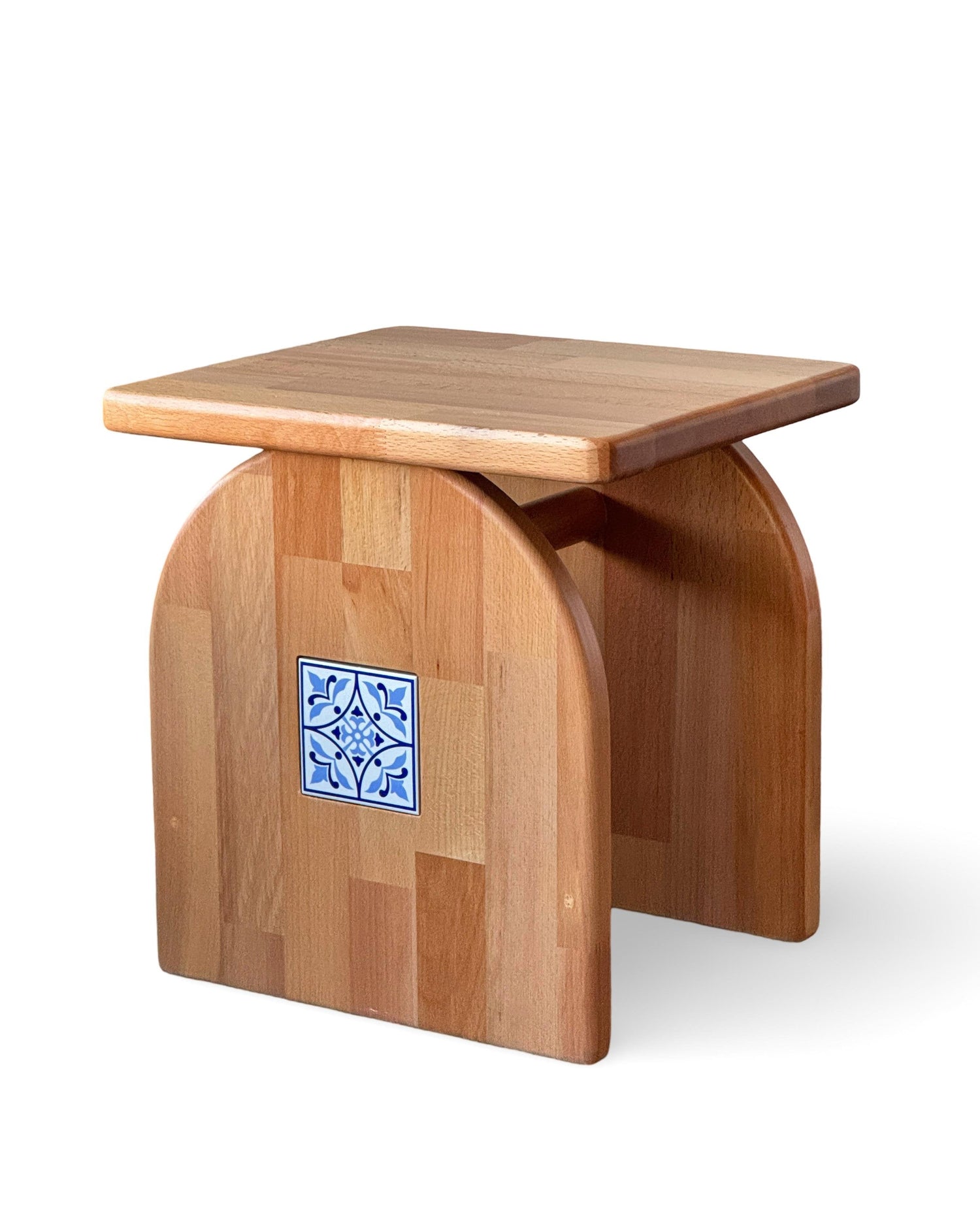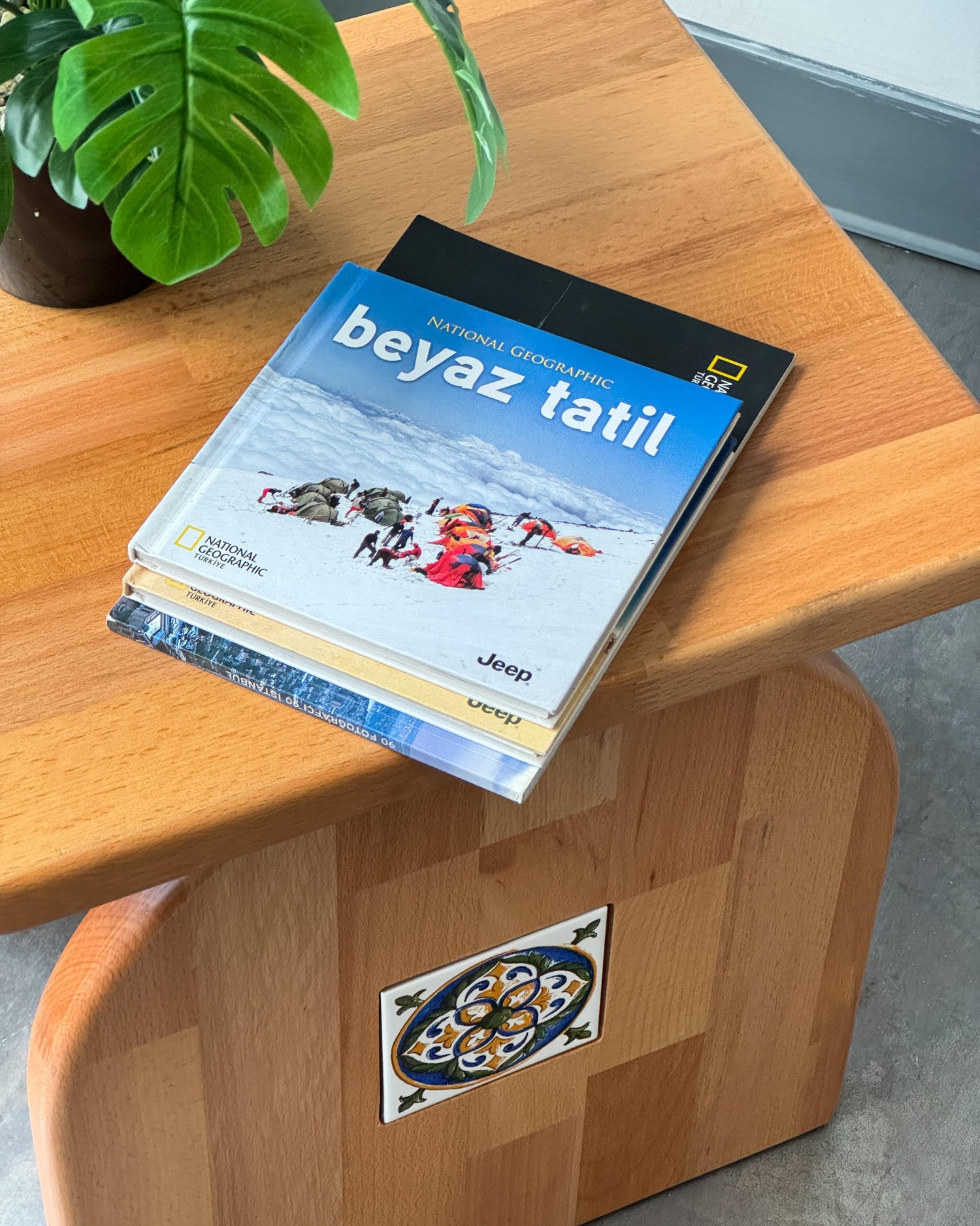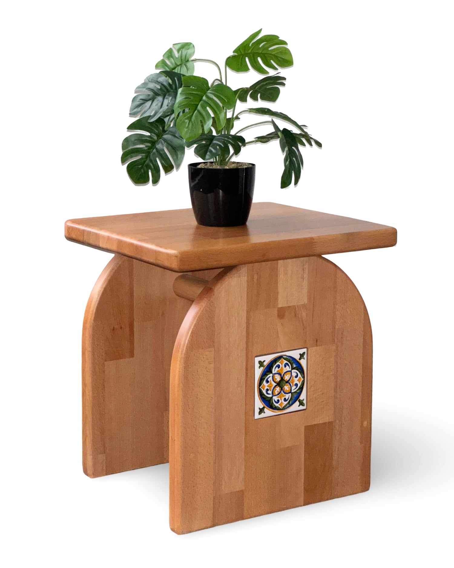 Estetik ve fonksiyonelliği bir araya getiren bu doğal ahşap yan sehpa, hem dekoratif bir yan sehpa hem de konforlu bir oturma taburesi olarak kullanılabilir. Ayakları oluşturan iki tablaya eklenen el yapımı özel çini seramikler, ürüne benzersiz bir zarafet katmaktadır. Bu detay, geleneksel ve modern tasarımın kusursuz bir uyumunu yansıtır. İstediğiniz çini desenini seçerek kolaylıkla siparişinizi oluşturabilirsiniz.