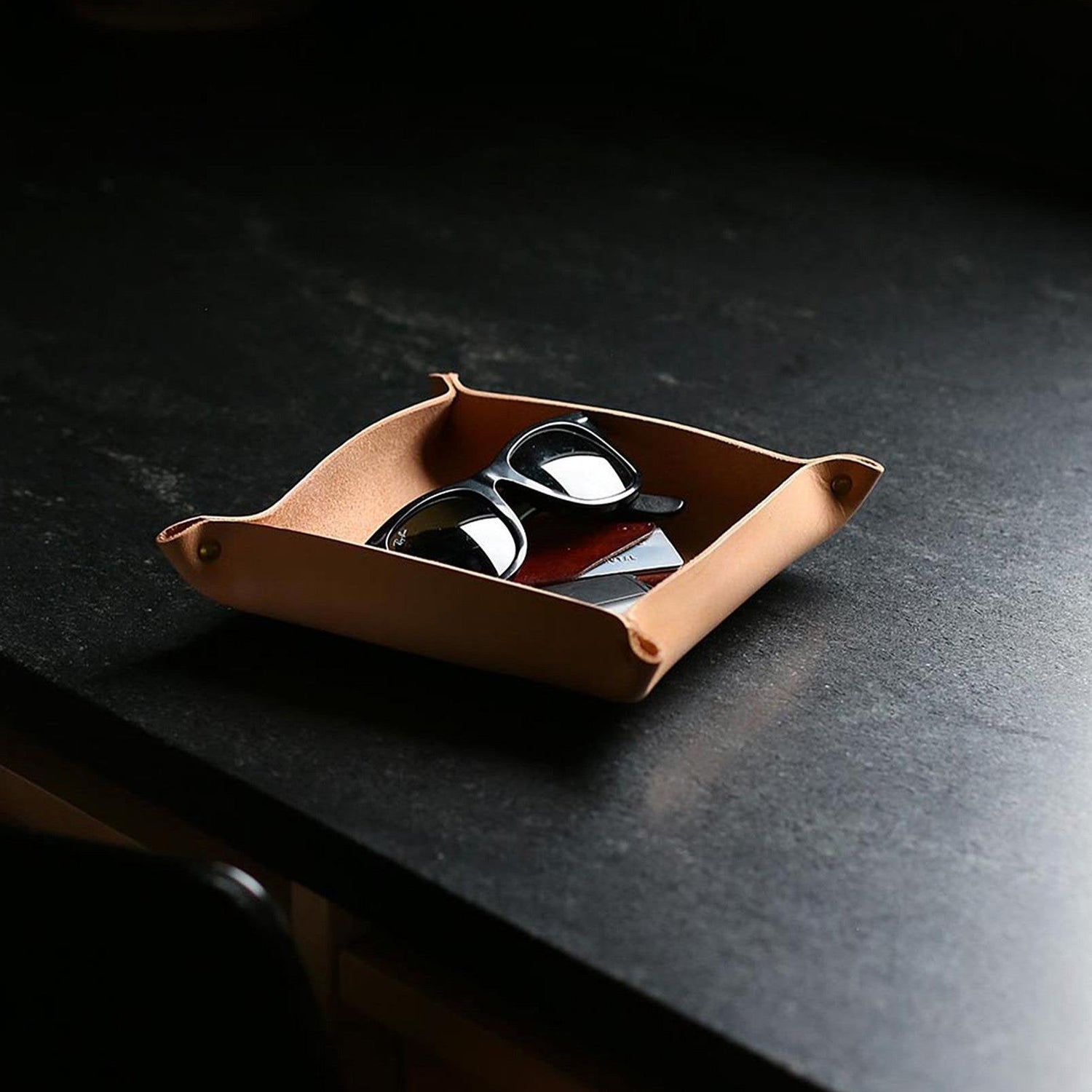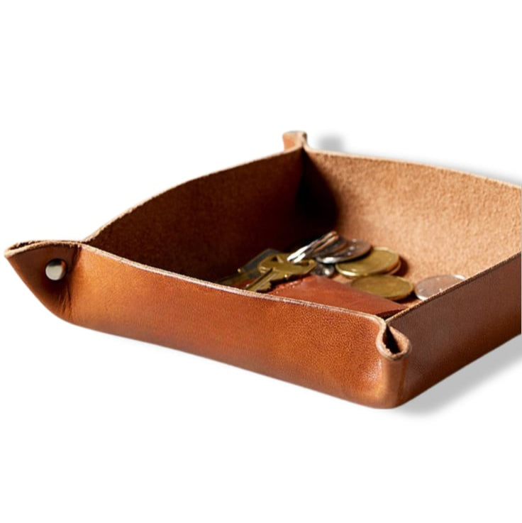 15x15x3 cm boyutlarındaki bu şık tepsi, cüzdan, anahtar, saat ve diğer küçük eşyalarınızı düzenli bir şekilde saklamanızı sağlar. Deri malzemenin sunduğu dayanıklılık, uzun ömürlü kullanım garantisi verirken, zarif tasarımıyla da göz kamaştırır.