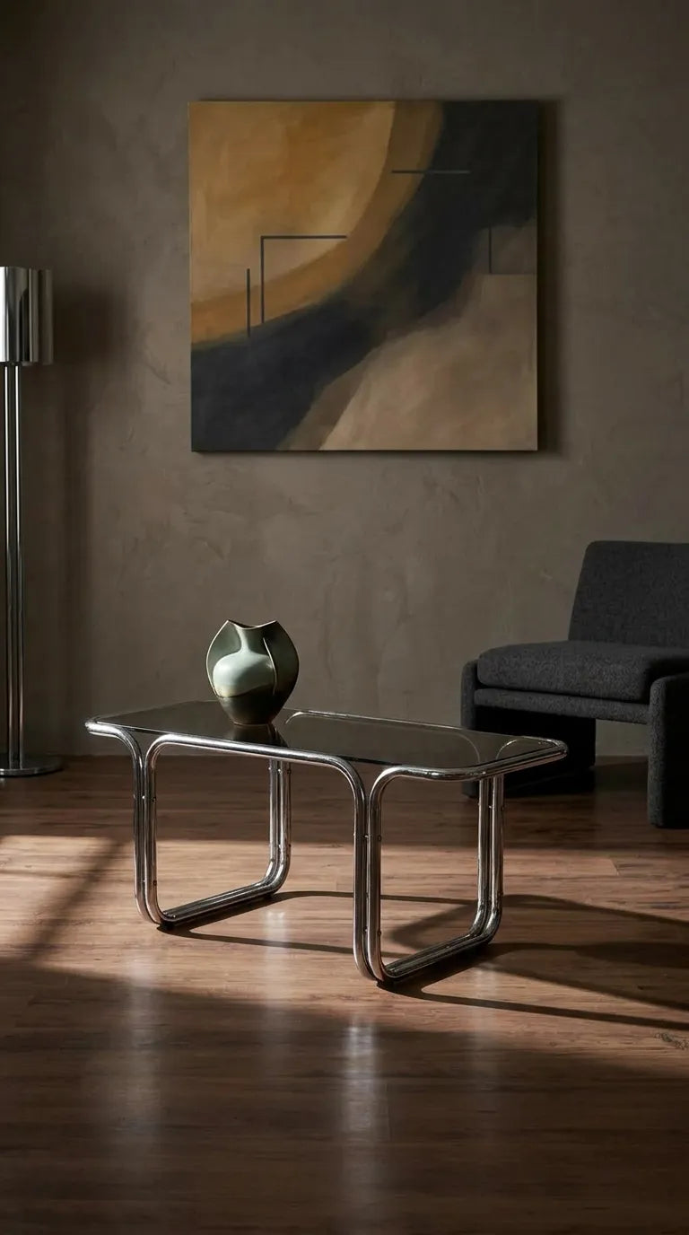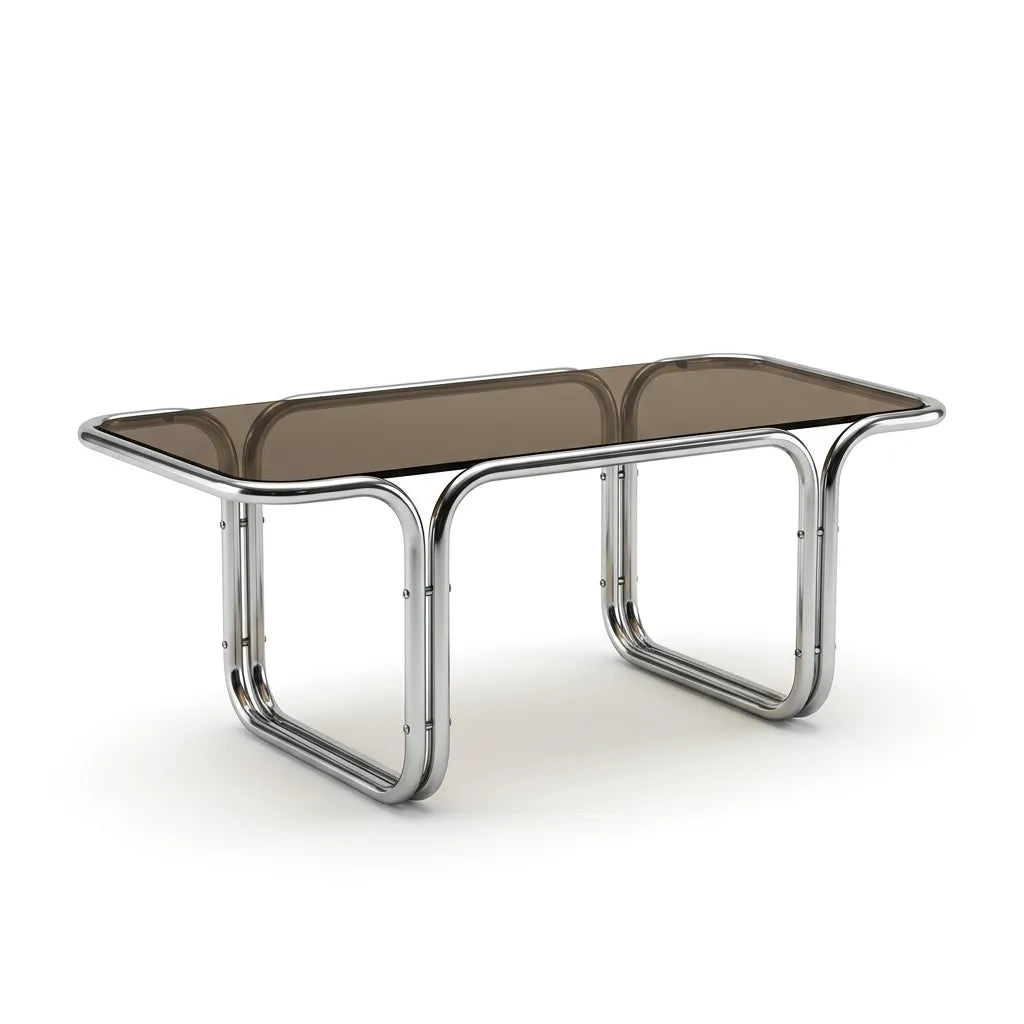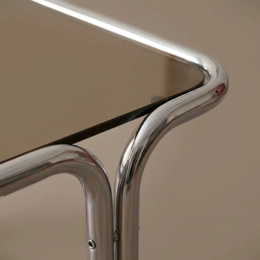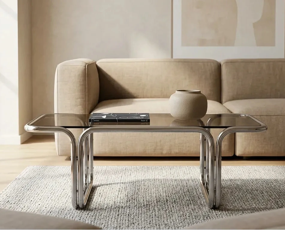 Parlak krom ayakların akışkan formu, mekâna hafiflik hissi verirken; füme ve şeffaf cam yüzey, alanı bölmeden ferah bir görünüm sunar. Minimal tasarım anlayışıyla şekillenen bu sehpa, modern ve doğal tonlarla kusursuz uyum yakalar.