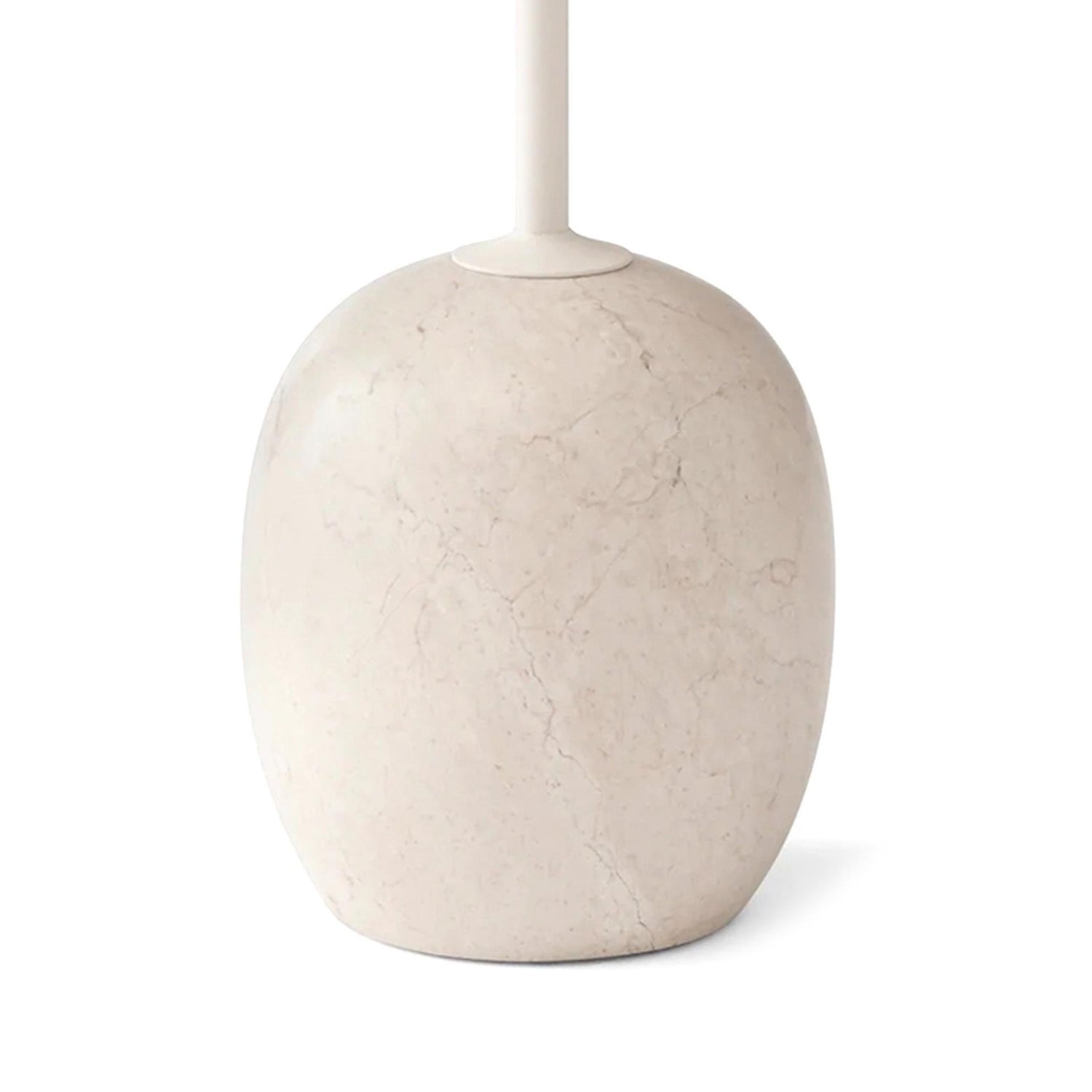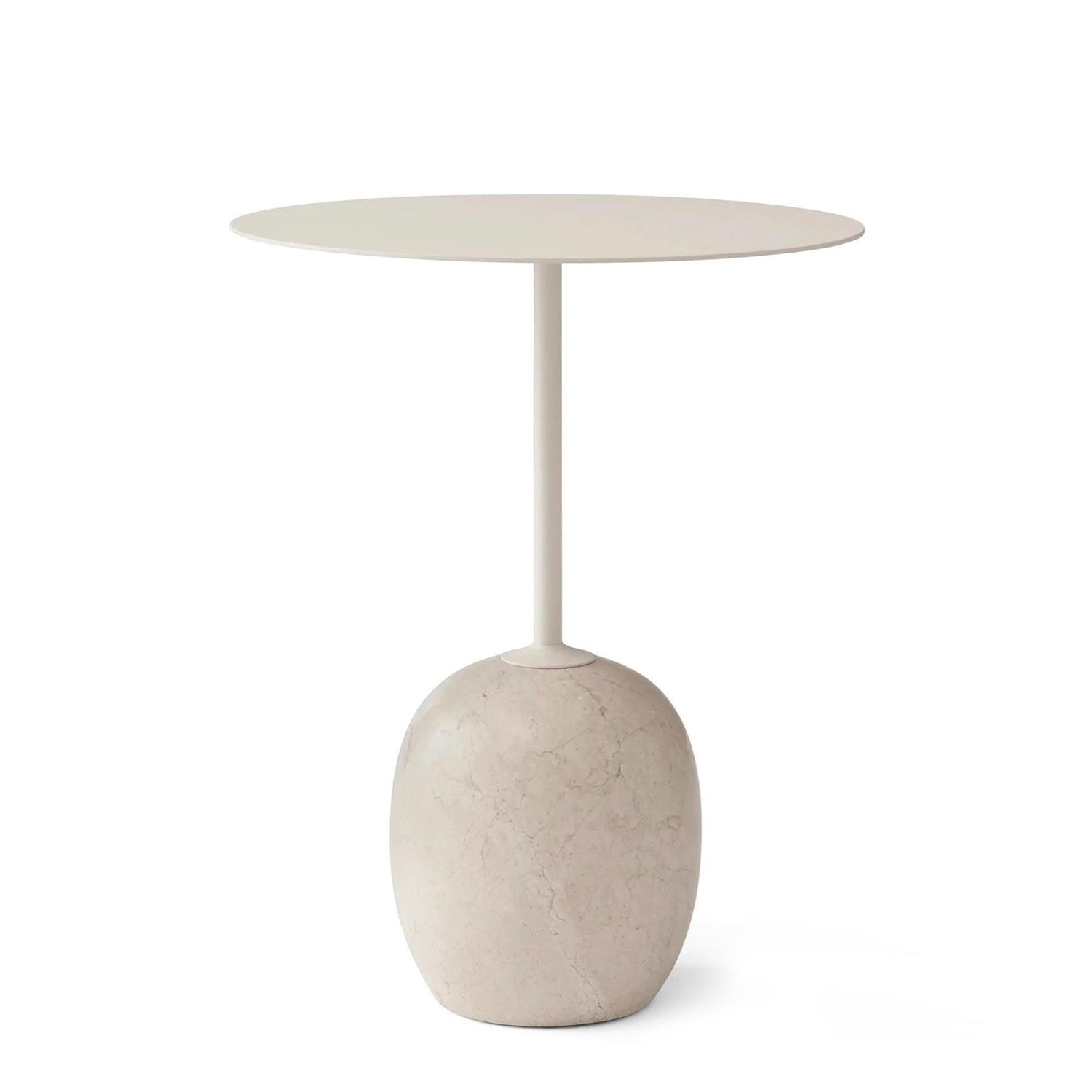 Doğal traverten mermer kaide üstünde beyaz fırın boyalı metal tabla bulunmaktadır. Tabla çapı 40 cm, ürün yüksekliği 50 cm.
