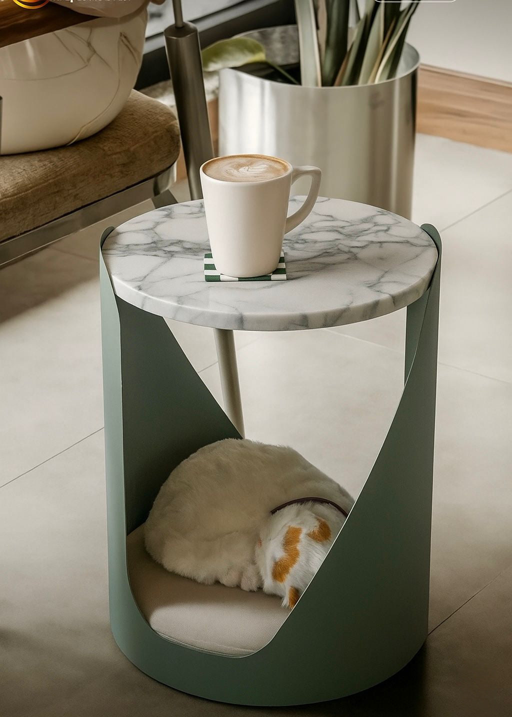 Fırın boyalı sağlam metal gövdesiyle uzun ömürlü kullanım sunarken, üst kısmındaki 30 cm çapındaki mermer tabla ile modern dekorasyonun vazgeçilmez bir parçası haline geliyor. Alt bölümde yer alan minder ise patili dostlarımız için yumuşacık ve konforlu bir alan yaratıyor.