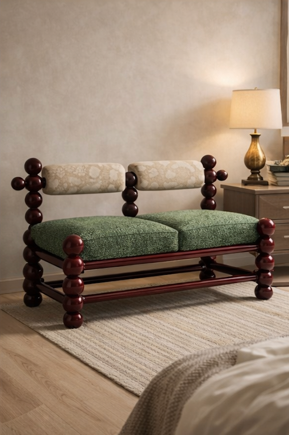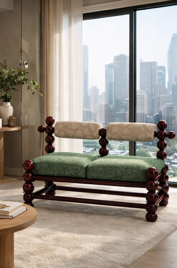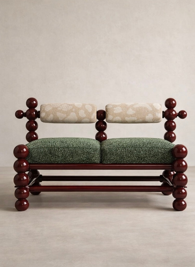 Sohomanje’nin karakteristik tasarım yaklaşımını yansıtan bu özel parça, formu yalnızca bir oturma elemanı olarak değil, mekânın merkezinde konumlanan bir obje olarak ele alır. Silindirik sırt formunda kullanılan dokulu ve nötr desenli kumaş, tasarıma sakin bir denge katarken; oturum alanındaki derin yeşil dokulu yüzey güçlü bir kontrast yaratır.